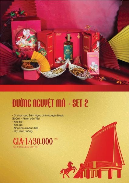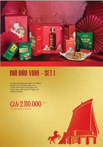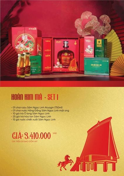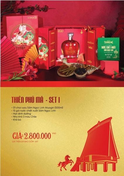 Set quà mang phong vị sang trọng – đậm chất tài lộc, nổi bật với rượu Sâm Ngọc Linh kết hợp các sản phẩm dinh dưỡng cao cấp.