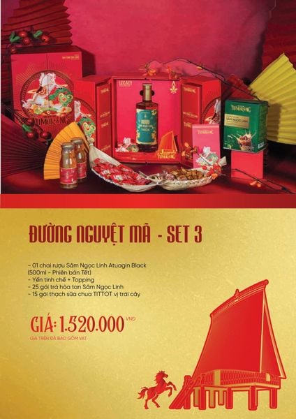 Bộ quà mang sắc thái sang trọng, tinh tế, kết hợp rượu Sâm Ngọc Linh nhãn Tết cùng yến tổ bồi bổ sức khỏe, phù hợp biếu tặng đối tác và khách hàng cao cấp.