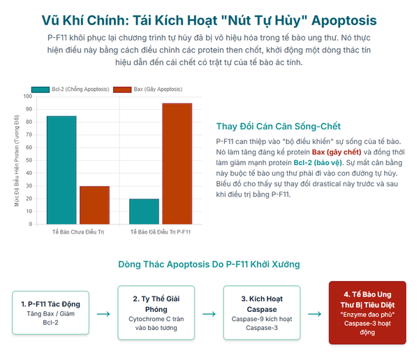 Điều Chỉnh Gia Đình Protein Bcl-2: Trong tế bào, có các protein thúc đẩy apoptosis (như Bax, Bak) và các protein chống lại apoptosis (như Bcl-2, Bcl-xL). Tế bào ung thư thường có mức protein chống apoptosis rất cao. P-F11 tác động làm tăng biểu hiện của Bax và giảm biểu hiện của Bcl-2, làm thay đổi cán cân nghiêng về phía tự hủy.