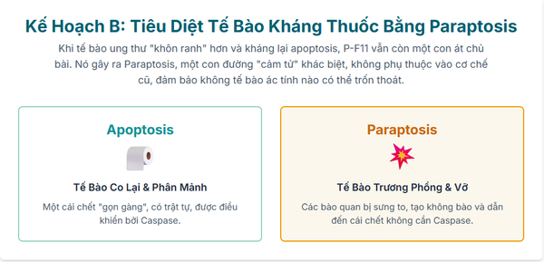 Tế bào ung thư rất "xảo quyệt". Một số dòng tế bào có thể phát triển khả năng kháng lại apoptosis, khiến cho nhiều liệu pháp hóa trị trở nên vô tác dụng. Đây là lúc P-F11 thể hiện sự ưu việt của mình bằng cách gây ra một dạng chết tế bào khác gọi là paraptosis.