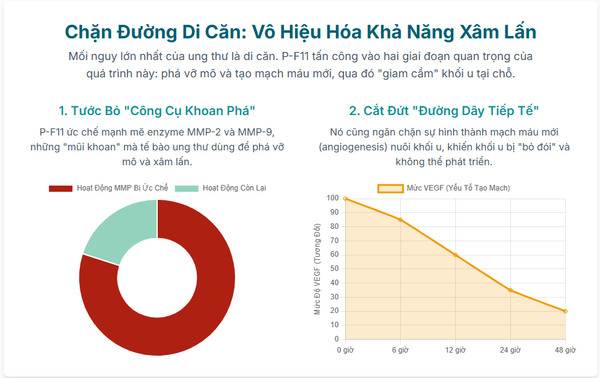 Để di căn, tế bào ung thư cần phải phá vỡ chất nền ngoại bào xung quanh chúng. Chúng làm điều này bằng cách tiết ra các enzyme gọi là Matrix Metalloproteinases (MMPs), đặc biệt là MMP-2 và MMP-9. Các nghiên cứu đã chỉ ra rằng P-F11 có khả năng ức chế hoạt động và biểu hiện của các enzyme MMPs. Điều này giống như việc tước đi "công cụ khoan phá" của tế bào ung thư, khiến chúng bị giam cầm tại chỗ và không thể xâm lấn sang các mô lân cận.