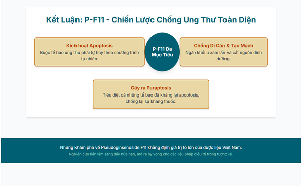 Pseudoginsenoside F11 từ Sâm Ngọc Linh không phải là một "viên đạn bạc" đơn lẻ mà là một "đội quân tinh nhuệ" tấn công ung thư từ nhiều mặt trận: kích hoạt tự hủy (apoptosis), sử dụng phương án dự phòng (paraptosis), và chặn đường di căn. Cách tiếp cận đa mục tiêu này làm giảm khả năng kháng thuốc của tế bào ung thư và tăng hiệu quả điều trị tổng thể.