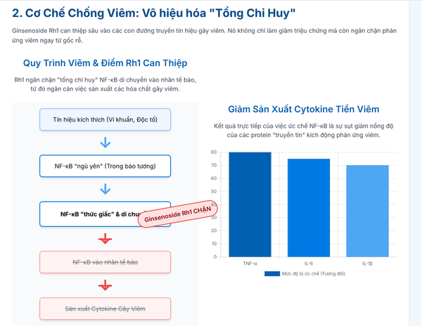 Nghiên cứu (như được đề cập trong tài liệu tham khảo về "Preparation of Polyethylene Glycol-Ginsenoside Rh1 and Rh2 Conjugates...") đã chứng minh rằng Ginsenoside Rh1 có khả năng ức chế sự kích hoạt của NF-κB. Bằng cách "khóa" không cho NF-κB di chuyển vào nhân, Rh1 đã ngăn chặn ngay từ gốc rễ việc sản xuất các hóa chất gây viêm.