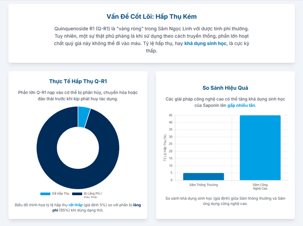 Kết quả là, dù chúng ta có nạp vào một lượng lớn Q-R1, nhưng tỷ lệ thực sự vào được máu (khả dụng sinh học) có thể rất thấp, chỉ vài phần trăm. Điều này có nghĩa là chúng ta đang lãng phí phần lớn dược tính quý giá của Sâm Ngọc Linh.