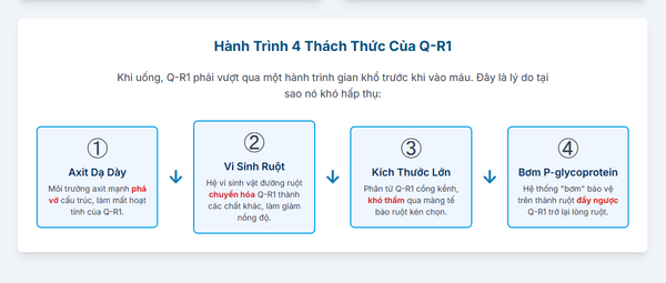 Bị "Đẩy" Trở Lại Ruột: Trên thành ruột có một hệ thống "bơm" bảo vệ gọi là P-glycoprotein. Khi phát hiện các "phân tử lạ" (như Q-R1) vừa thấm qua, hệ thống này có thể nhận diện và "bơm" chúng ngược trở lại lòng ruột, làm giảm đáng kể khả năng hấp thụ.