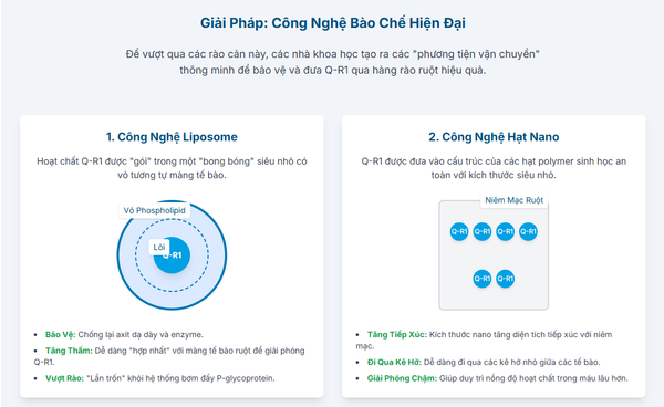 Nhận thức rõ thách thức này, các nhà khoa học trên thế giới (như các nghiên cứu được trích dẫn về "liposomes", "nanoparticles") đã không ngừng tìm kiếm giải pháp. Mục tiêu là tạo ra một "phương tiện vận chuyển" thông minh để bảo vệ và đưa Q-R1 qua hàng rào ruột.