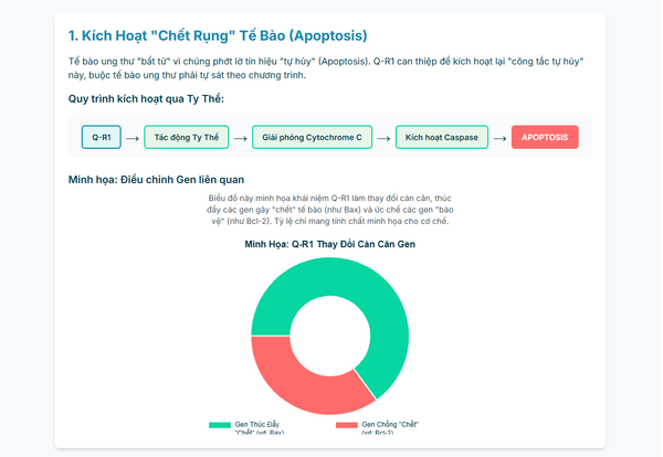 Điều Chỉnh Gen Liên Quan: Q-R1 có thể ảnh hưởng đến sự biểu hiện của các gen điều hòa sự sống và cái chết của tế bào. Nó có thể làm giảm biểu hiện của các gen chống apoptosis (như Bcl-2) và tăng biểu hiện của các gen thúc đẩy apoptosis (như Bax).