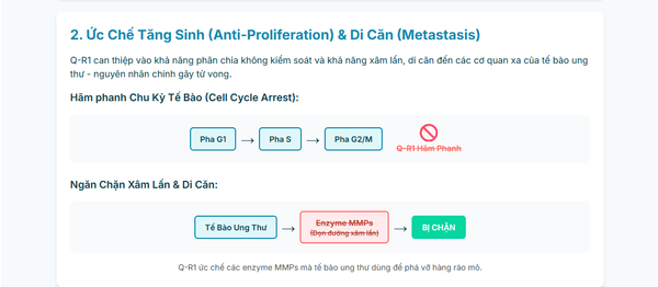 Chặn Chu Kỳ Tế Bào: Mọi tế bào, kể cả tế bào ung thư, đều phải trải qua một chu kỳ (cell cycle) để phân chia. Các nghiên cứu chỉ ra rằng saponin có thể "hãm phanh" chu kỳ này, thường là ở pha G1 hoặc G2/M. Bằng cách ngăn tế bào ung thư hoàn thành chu kỳ, Q-R1 làm chậm hoặc ngừng sự phát triển của khối u.