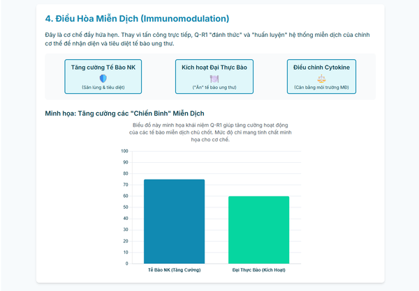 Tế bào ung thư rất "xảo quyệt", chúng thường "ngụy trang" để né tránh sự phát hiện của các tế bào miễn dịch (như tế bào T). Các saponin trong Sâm Ngọc Linh, bao gồm Q-R1, được chứng minh là có đặc tính điều hòa miễn dịch (immunomodulatory) mạnh mẽ: