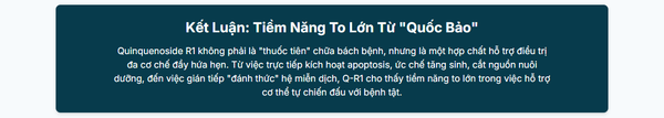 Quinquenoside R1 không phải là "thuốc tiên" chữa bách bệnh ung thư. Tuy nhiên, các bằng chứng khoa học ngày càng củng cố vai trò của nó như một hợp chất hỗ trợ điều trị đa cơ chế. Từ việc trực tiếp kích hoạt apoptosis, ức chế tăng sinh, cắt nguồn nuôi dưỡng, đến việc gián tiếp "đánh thức" hệ miễn dịch, Q-R1 cho thấy tiềm năng to lớn.