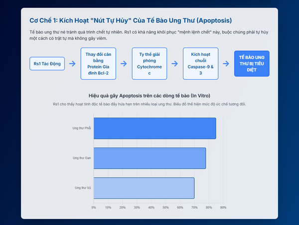 Khi màng ty thể bị tổn thương, nó sẽ giải phóng Cytochrome c vào bào tương. Cytochrome c sau đó sẽ kích hoạt một chuỗi các enzyme gọi là caspase (đặc biệt là Caspase-9 và Caspase-3), đóng vai trò như những "kẻ hành quyết". Caspase-3 được kích hoạt sẽ phân cắt các protein cấu trúc và chức năng quan trọng, dẫn đến việc tế bào ung thư co lại, phân mảnh và cuối cùng là bị các tế bào miễn dịch "dọn dẹp" một cách gọn gàng mà không gây ra phản ứng viêm. Các nghiên cứu in vitro đã cho thấy Rs1 có thể gây ra apoptosis trên nhiều dòng tế bào ung thư khác nhau, bao gồm ung thư phổi, gan và vú, với chỉ số độc tính tế bào (IC50) đầy hứa hẹn.
