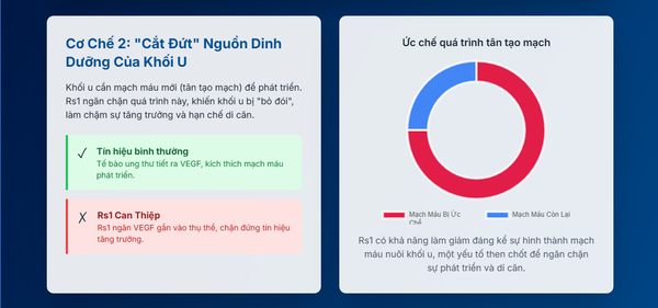 Ức chế Tín hiệu VEGF: Rs1 hoạt động bằng cách can thiệp vào con đường tín hiệu của VEGF. Nó ngăn chặn VEGF gắn vào thụ thể của nó (VEGFR) trên bề mặt tế bào nội mô (tế bào lót lòng mạch máu). Khi tín hiệu này bị chặn, các tế bào nội mô sẽ không nhận được lệnh để tăng sinh, di chuyển và hình thành các cấu trúc ống mạch mới. Kết quả là, mạng lưới mạch máu nuôi dưỡng khối u không thể phát triển, khiến khối u bị "bỏ đói", ngừng phát triển và thậm chí có thể teo nhỏ lại.