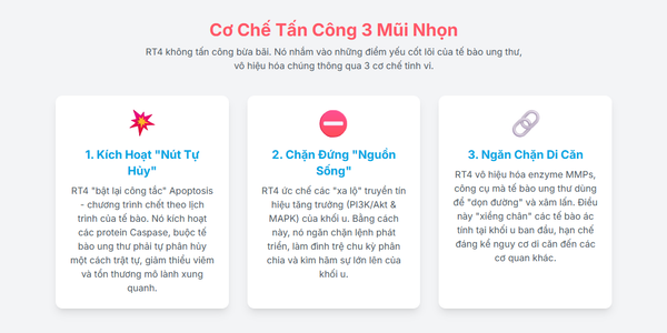 RT4 tác động trực tiếp vào các "xa lộ" này. Nó ức chế hoạt động của các protein chủ chốt trong chuỗi tín hiệu, giống như việc dựng lên các rào chắn, ngăn chặn lệnh tăng trưởng đến được với nhân tế bào. Khi không còn nhận được tín hiệu cần thiết, chu kỳ phân chia của tế bào ung thư bị đình trệ, làm chậm hoặc ngăn chặn hoàn toàn sự phát triển của khối u.