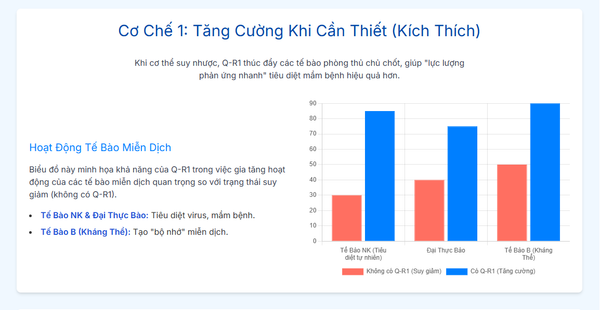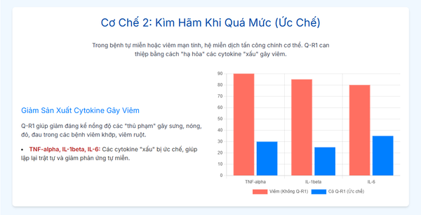 Đây là điểm làm nên giá trị "điều hòa" của Q-R1. Trong các tình trạng viêm mạn tính hoặc bệnh tự miễn, hệ miễn dịch tấn công vô cớ. Q-R1 có thể can thiệp: