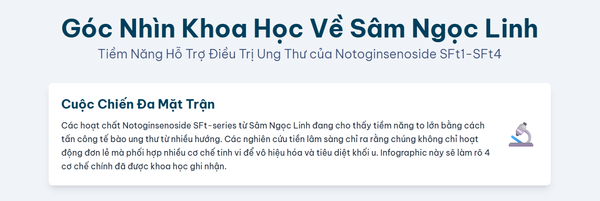 Ung thư vẫn luôn là một trong những thách thức lớn nhất của y học. Bên cạnh các phương pháp điều trị chính thống như phẫu thuật, hóa trị, xạ trị, các nhà khoa học trên khắp thế giới không ngừng tìm kiếm các hợp chất tự nhiên có khả năng hỗ trợ, tăng cường hiệu quả điều trị và giảm tác dụng phụ. Trong số đó, nhóm hoạt chất Notoginsenoside SFt1, SFt2, SFt3 và SFt4 từ Sâm Ngọc Linh đang nổi lên như một ứng cử viên đầy hứa hẹn.