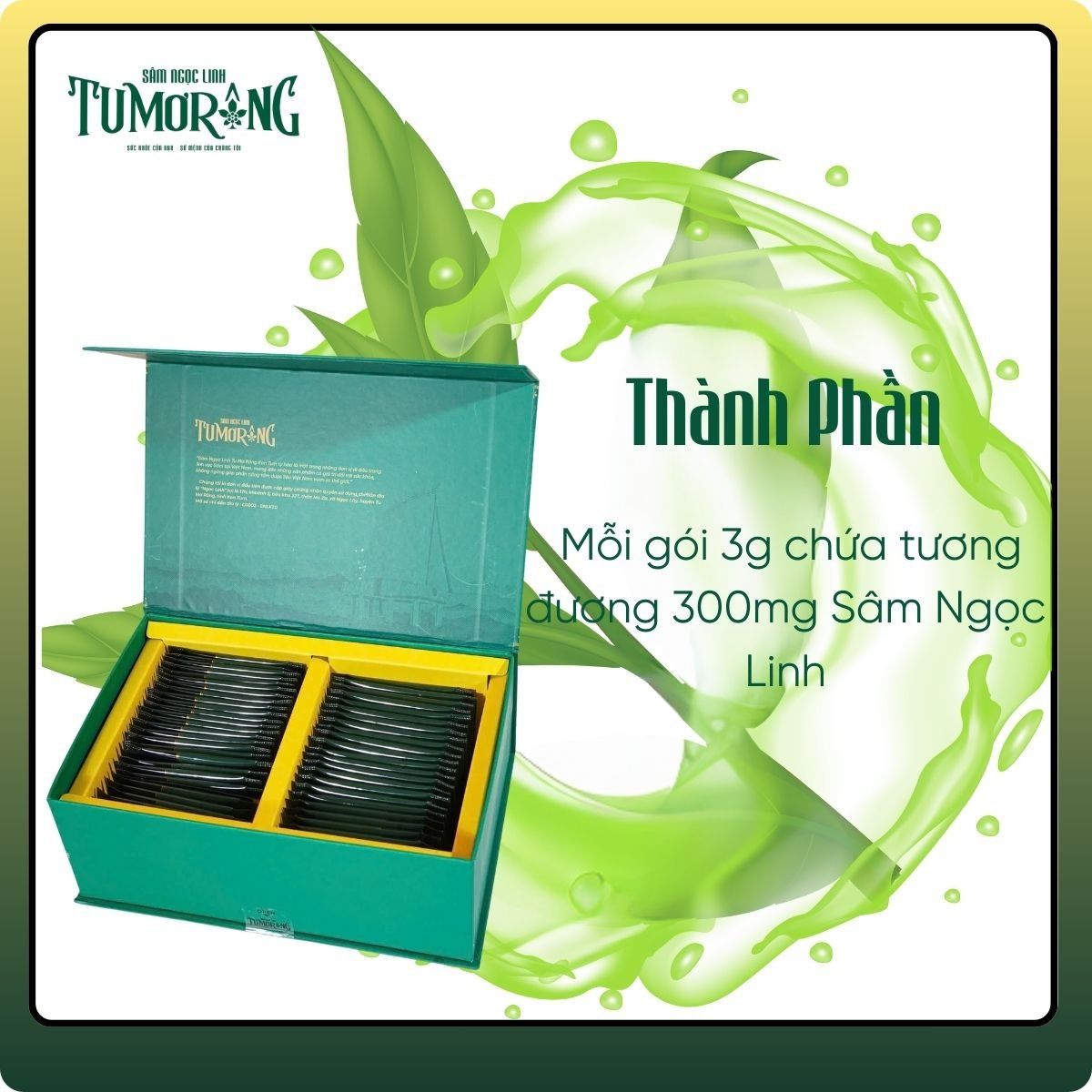 Mỗi gói trà chứa 30mg chiết xuất khô Sâm Ngọc Linh cùng tá dược vừa đủ. Sản phẩm được sản xuất bằng công nghệ chiết xuất tiên tiến, giúp giữ lại 100% dưỡng chất tự nhiên và đảm bảo chất lượng ổn định.